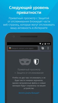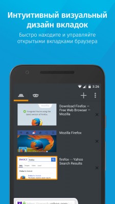 Собственный движок Gecko, который использует Firefox, поддерживает практически все современные стандарты веба, а также для него имеются расширения с дополнительным функционалом, как и в десктопной версии браузера. Среди основных функций Fiefox: синхронизация всех данных между браузерами с помощью специального аккаунта, безопасный серфинг, удобная стартовая панель, масса расширений, режим чтения.
