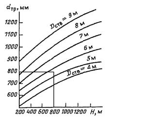 Диаметр вентиляционных металлических труб для стволов диаметром 4-9 м и глубиной 200-1400 м можно определить согласно графику: