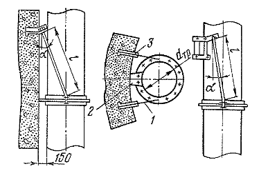 1-тяга (угол наклона тяги α в зависимости от диаметра труб изменяется в пределах 15-200; длина l=1200-1600 мм);