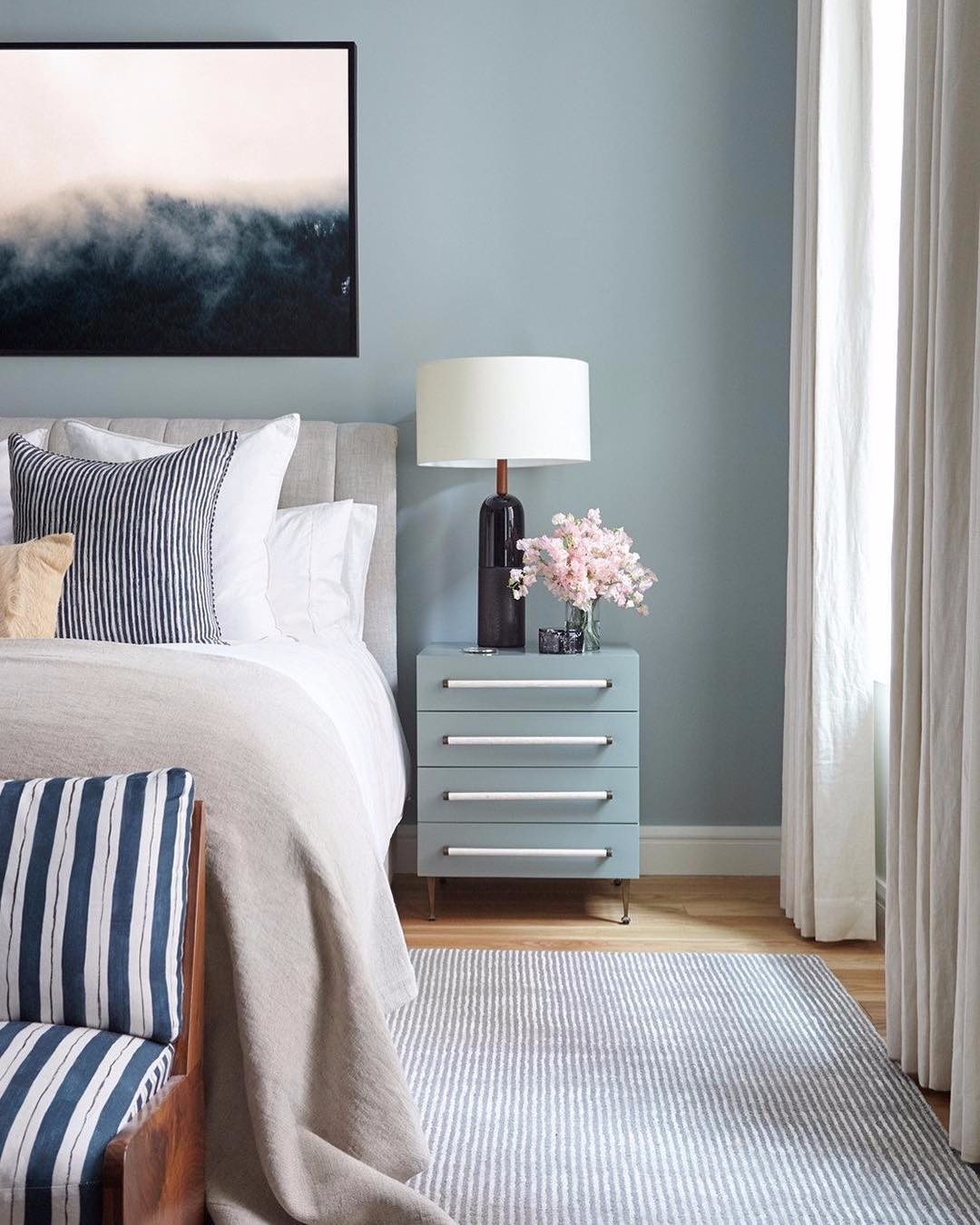 Голубой или серый? С первого взгляда кажется, что стены ближе к голубому, но цвет сложный — припыленный серым. Слегка строгая, но при этом притягивающая композиция для спальни. Нежные оттенки текстиля и букета цветов на столике добавляют романтичности.