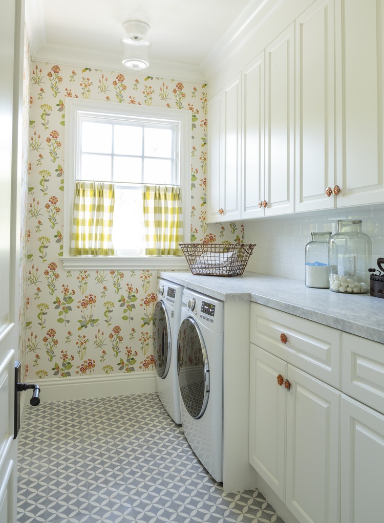 Столешницу над стиральной машинкой в этом интерьере можно выгодно использовать как вместительную полочку.