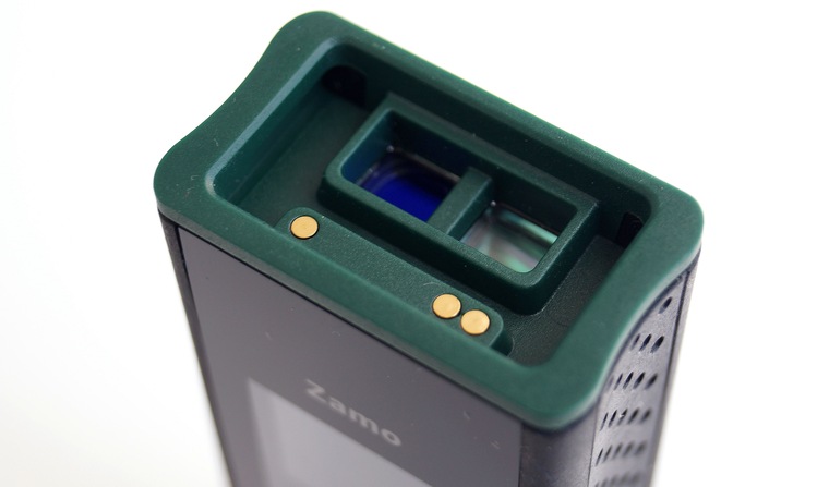 Рассмотрим Zamo III Set подробнее. Несмотря на всю заранее известную о нем информацию, дальномер оказался компактнее, чем ожидалось. Основная часть корпуса полностью черного цвета, кроме зеленых элементов в нижней и верхней части. На боковых сторонах присутствую резиновые ставки. Также эти стороны немного вогнуты во внутреннюю часть корпуса для удобного хвата прибора. На лицевой стороне находится единственный орган управления, а именно кнопка включения.