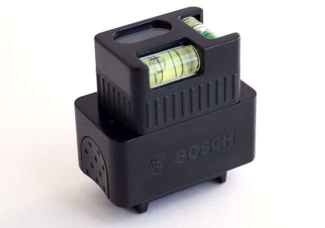 Данный адаптер превращает дальномер, как вы могли догадаться, в линейный лазерный уровень. Теперь устройство способно отбивать горизонтальную или вертикальную линию наподобие той что, мы видим у нивелиров. Но не будем путать, в данном случае это просто короткая линия, которая не умеет само-выравниваться относительно горизонтальной или вертикальной плоскости, поэтому адаптер имеет два пузырьковых уровня для ровного размещения дальномера и получения правильного положения.