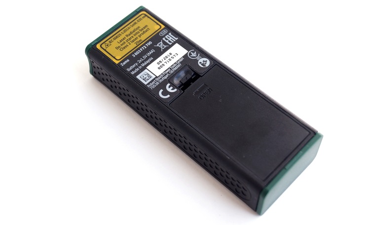 Сзади — стандартные для большинства дальномеров техническая информация и обязательная табличка с предупреждением не светить лазером в глаза, а также крышка отсека для элементов питания.