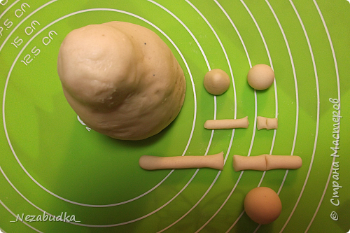 4. Раскатываем соленое тесто в тоненькие жгутики и прикрепите к туловищу лапки.
