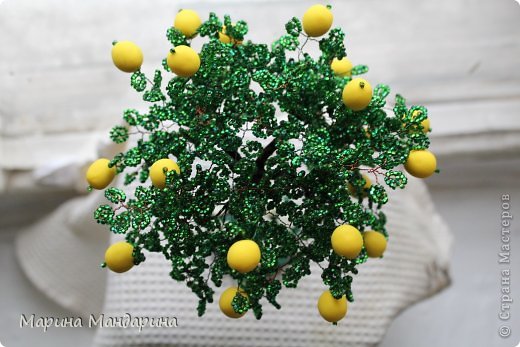 Цитрусовые – значит лимонное, апельсиновое либо мандариновое. Все цитрусовые кустарники из стекляруса плетутся петельным способом – гроздья с бусинами яркого окраса, которые являются плодами.