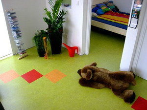 В детской комнате постелили светло-розовый натуральный линолеум. Легко моется, даже следы от фломастеров. Не вреден для здоровья, нет запаха. Детская выходит на солнечную сторону, так радует то, что линолеум не выгорел. Дороговат, укладку лучше доверять профессионалам.