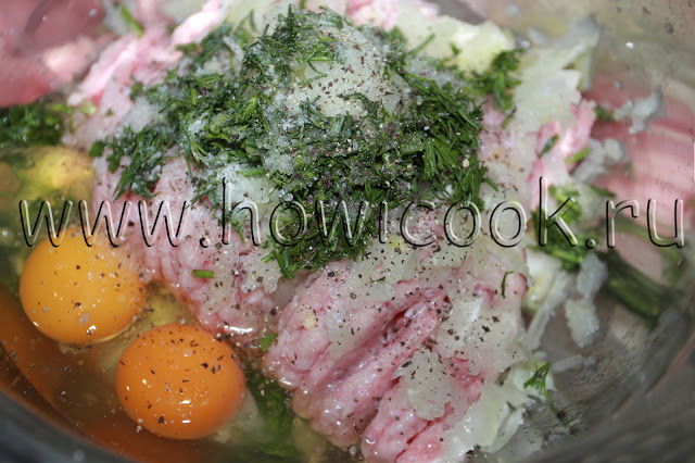 Лук натереть на терке, укроп мелко нарезать, смешать с фаршем, посолить, поперчить.