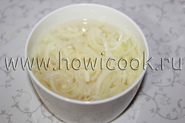 Отдельно нарезать тонкими полукольцами 1 луковицу, замариновать в воде и уксусе (пропорции по вкусу).