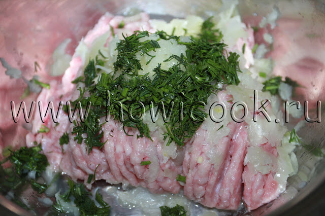 - Измельчить лук, чеснок и зелень, соединить с фаршем и остальными компонентами.