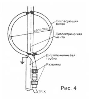 Проще всего согласовать антенную рамку и линию питания с помощью витка коаксиального кабеля типа RG8 или RG213 Диаметр витка определяется опытным путем (примерно около 0,5 м). Подключение внутренней жилы и оболочки кабеля осуществляется в соответствии с рис.4