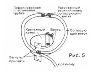 После того как согласующий виток настроен на наименьший КСВ, для защиты от осадков поверх места подключения натягивается гофрированная пластмассовая трубка. На конце согласующего витка нужно установить коаксиальный разъем. В месте нижнего крепления согласующего витка под крепежный дюралюминиевый хомут продевается кусок медной ленты, которая после загибания припаивается к экранирующей оболочке кабеля. Она нужна для хорошего электрического контакта с заземленной дюралевой трубкой (рис.5). В верхней части согласующий виток крепится к диэлектрической мачте резиновыми хомутиками.