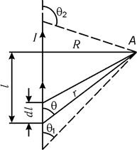 Найдем вектор магнитной индукции в точке A, отстоящей от прямолинейного проводника с током на расстояние R. С этой целью воспользуемся законом Био–Савара–Лапласа (17.16). Для вычисления интеграла (17.16) выразим переменные r и dl через q.