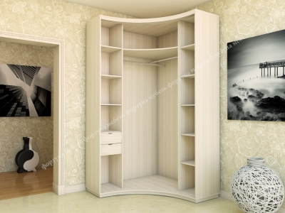 - Оригинальный внешний вид: угловой шкаф может быть вогнутым или выпуклым, симметричным и асимметричным, возможно любое наполнение, варианты декора и даже оформление фотопечатью. Радиусные шкафы всегда выделяются на фоне остальной мебели, делая интерьер современным и необычным.