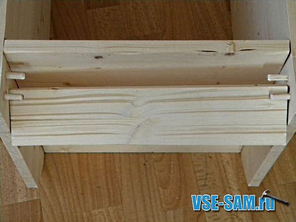 Следующий шаг — это изготовление полозьев для выдвижного ящика, который будет расположен в верхней части тумбы. Они выпиливаются из фанеры 6 мм. Крепим их по боковым стенкам тумбочки.