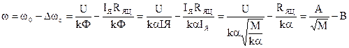 Подставив в него вместо э.д.с. вращения Е ее значение и решив полученное уравнение относительно скорости, получим зависимость скорости двигателя ω от тока якоря IЯ ω=f(IЯ), которая называется электромеханической характеристикой: