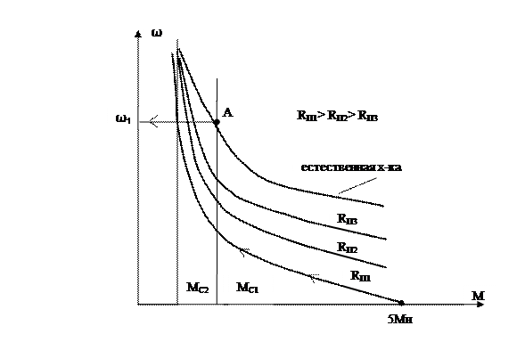 Рис. 2.9. Механические характеристики двигателя постоянного тока последовательного возбуждения.