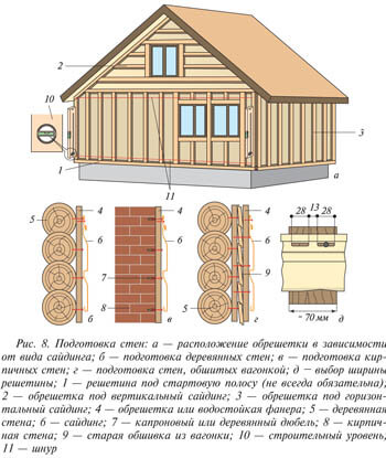 На стенах нового здания обрешетка монтируется только после того, как все строительные и фасадные работы завершены. Если здание ремонтируется, то стены должны быть освобождены от выступающих деталей, включая наличники оконных, дверных проемов. На поверхности стен не должно оставаться вбитых гвоздей, других подобных мелочей. Если в стене есть поврежденные или сгнившие доски — их надо заменить, а если какие-то элементы держатся непрочно — зафиксировать их покрепче.