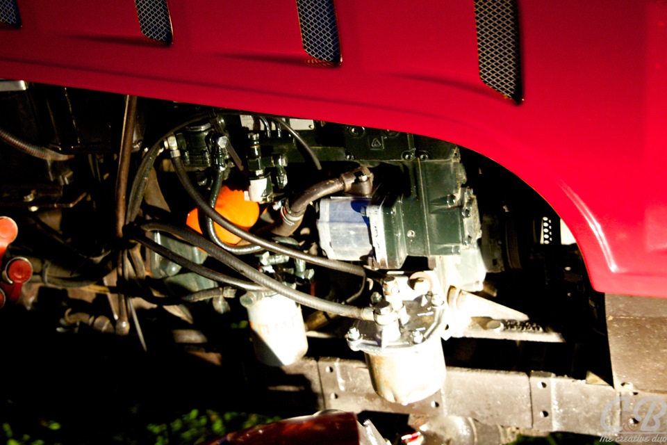 — при колее передних колес 1060мм и развороте (повороте руля вправо на максимум) на ямках с небольшим отрывом правого переднего колеса — кронштейн крепления брызговика упирается в топливный фильтр-отстойник и коробит его с диким скрежетом. Я сначала даже не понял что случилось. Обнаружил только на следующий день, когда проверял состояние трактора, что фильтр-отстойник помят, будто его кто молотком долбал. Как решил проблему? Очень просто. Мне в принципе для моих сх нужд нужна колея пошире. Посиму, перекинув колеса (наружней частью вовнутрь) и, соответственно, брызговики под колею 1210мм проблема самоустранилась.