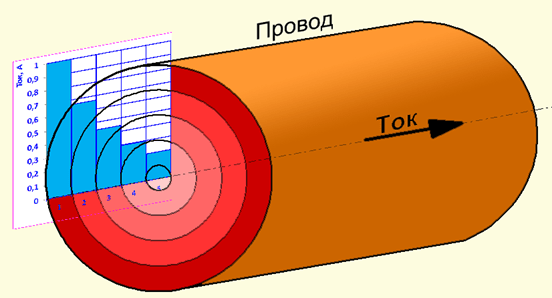 Второй причиной нагрева проводника является поверхностный эффект, или так называемый скин-эффект. Этот эффект обусловлен природой электрического тока, который неравномерно распределяется в проводнике. Электрический ток стремиться к поверхности проводника.