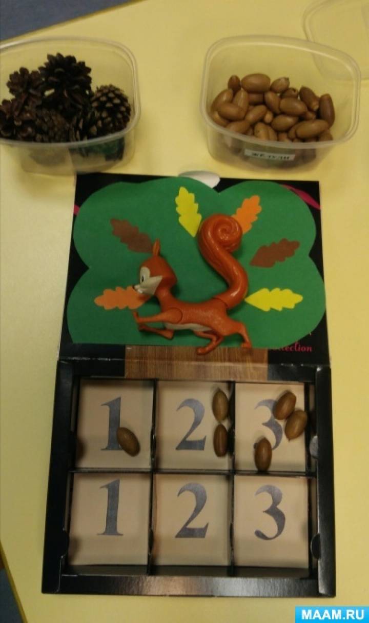 Цель: развитие мелкой моторики посредством игр и манипуляций с природным бросовым материалом. Задачи: Обучающие: формировать знания о разнообразии природных бросовых материалах (желудях, шишках, семян тыквы и др, закрепить знания о цифрах и порядковом счёте от одного до трёх.